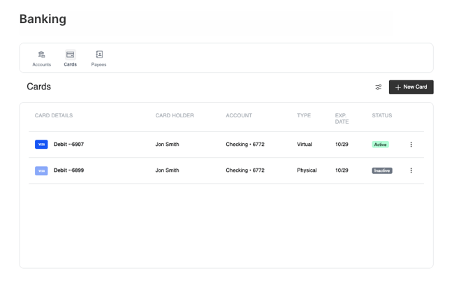 3. Once on the Cards page, select the ellipsis icon on the physical card you wish to replace - Click Replace Card