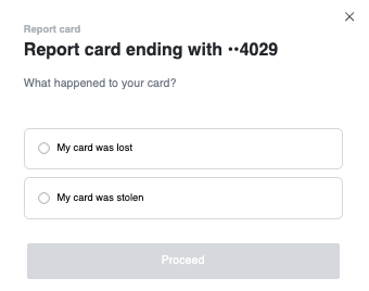 4. In a new pop-up, select if My card was lost or My card was stolen