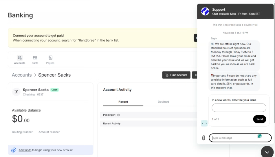 For any inquiries regarding your RentSpree Money account, please use the chat feature on your RentSpree dashboard to speak with a RentSpree Money representative.