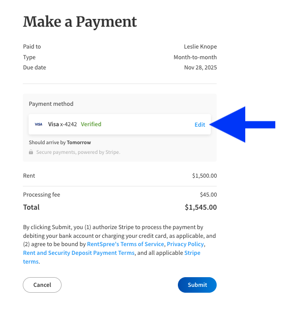 3. Click the Edit button to change the payment method
