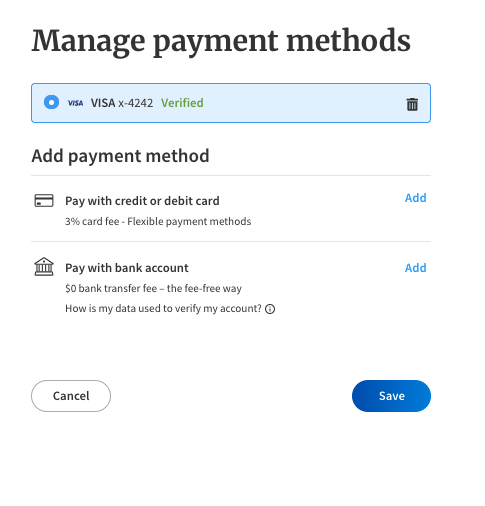 4. On the Manage payments methods page, click the Add button to enter an alternative payment method or the Trash Can icon next to connected payment account to delete it from your dashboard