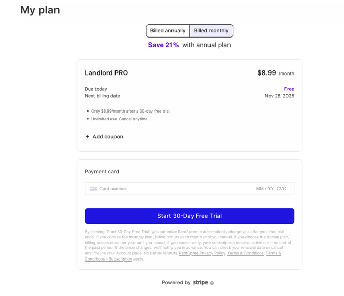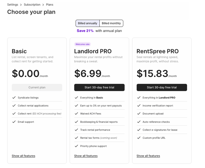 On the Manage Pro page, you’ll see the option to sign up for Landlord PRO either monthly or annually