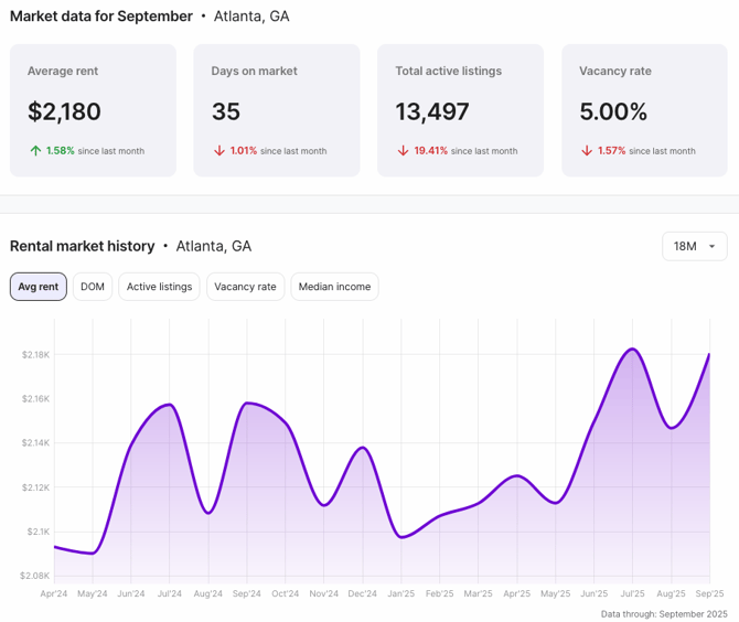 Explore interactive charts showing average rent, days on market, and vacancy rate trends.