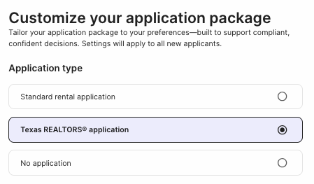 This can be done by selecting the Texas REALTORS® Rental Application on the Application Options step when sending a request.