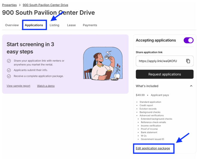 How can I change my screening package? You can update your screening package anytime by logging into RentSpree, going to the Properties tab, selecting your property, and clicking Edit application package.